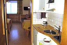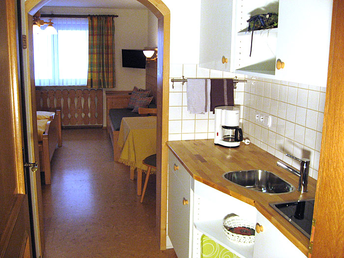 Einraumapartment im Erdgeschoss, Größe 28qm, 2 Betten, Kochnische komplett ausgestattet, 2 Plattenherd, Kühlschrank, Flachbild-TV mit Satellit-Anschluss, Sitzmöglichkeiten vor dem Haus, für Allergiker geeignet,